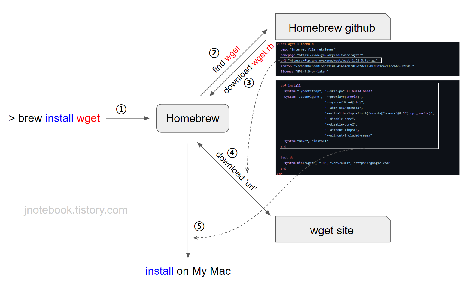 Homebrew(이하 brew)는 ruby 와 git 기반으로 되어 있으며 패키지 저장소로 github을 사용하고 있다. 그렇다고 해서 brew 가 모든 소프트웨어 패키지의 설치파일을 모두 가지고 있는 것은 아니다. 패키지 저장소에는 각 패키지의 정보, 다운로드 url, checksum, 의존성 정보 그리고 install 명령을 정의하고 있는 ruby 파일(.rb)을 가지고 있다.