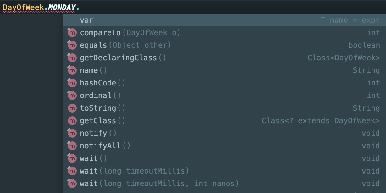 enum type 은 매우 독특한데 enum의 각 열거 상수(위 예시의 MONDAY, TUESDAY...)들은 각각 하나의 객체들이고 이는 최상위 Object 를 상속 받고 있음을 의미한다. 그렇기 때문에 우리가 기대할 수 있는 여러 method 들이 존재한다. 또한 하나의 객체이기 때문에 추상메소드나 인터페이스의 구현을 추가할 수도 있다.